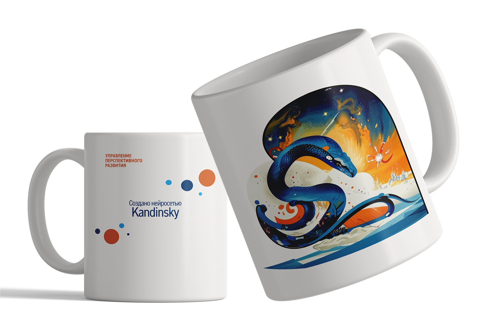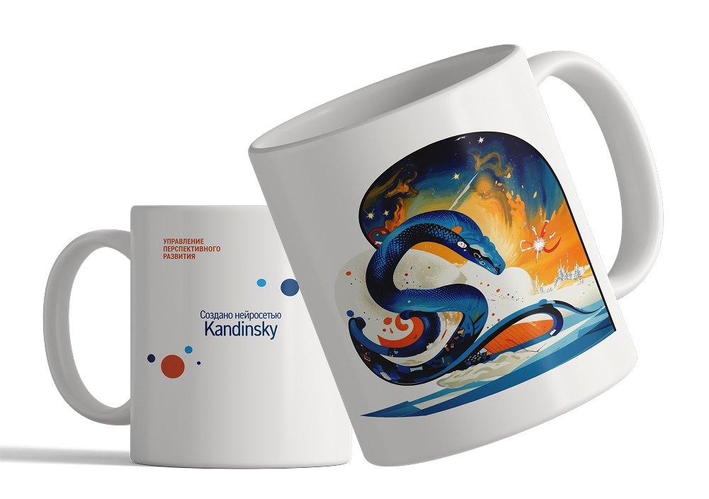 Результатом генераций по запросам умелых сотрудников перспективного развития стало рождение четырех эксклюзивных рисунков с символом нового 2025 года, которые были перенесены на фарфоровые бокалы.